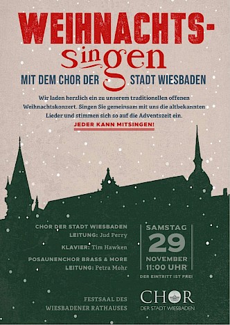 Auch in diesem Jahr veranstalten wir wieder unser traditionelles offenes Weihnachtskonzert. Am 29. November um 11 Uhr im Festsaal des Wiesbadener Rathauses sind alle herzlich eingeladen, bekannte Weihnachtslieder mit uns zu singen und sich so auf die kommende Adventszeit einzustimmen. Am Klavier begleitet uns Tim Hawken, es spielt der Posaunenchor Brass & More. Der Eintritt ist frei, jeder kann mitsingen!